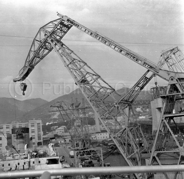 GRU AL LAVORO PRESSO I CANTIERI NAVALI ANSALDO DI SESTRI PONENTE, NEL PORTO DI GENOVA DURANTE LE OPERAZIONI DI CARICO E SCARICO DELLE NAVI E PRESSO LE RIPARAZIONI NAVALI O.A.R.N. SUL MOLO GIANO.