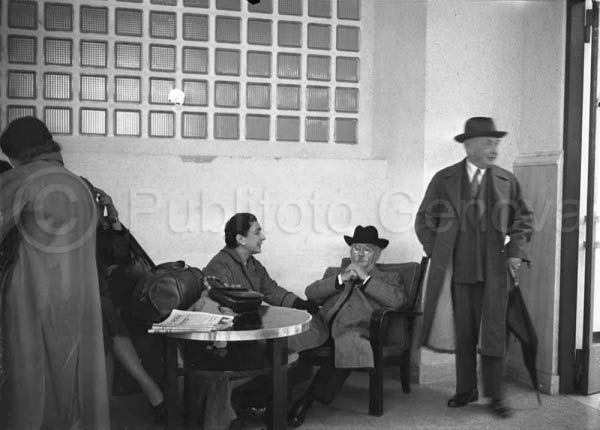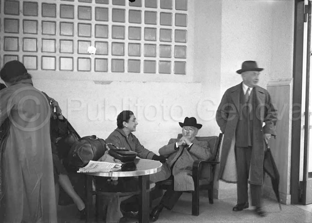 DESCRIZIONE:IL DIRETTORE D'ORCHESTRA ARTURO TOSCANINI IN PARTENZA PER GLI STATI UNITI D'AMERICA DALLA STAZIONE MARITTIMA DI GENOVA