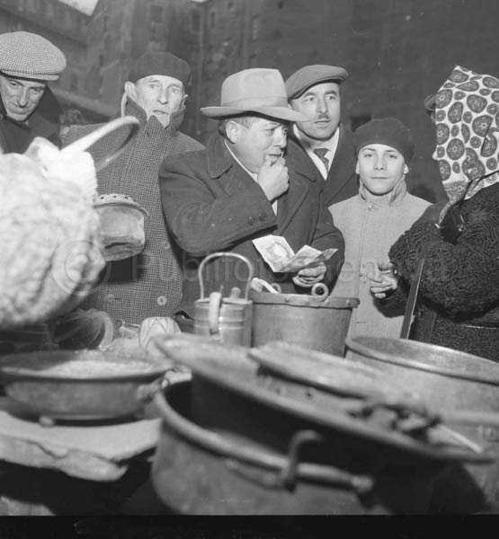 DESCRIZIONE:LA FIERA DI S. AGATA A GENOVA- UN VENDITORE IMPUGNA UNA BANCONOTA DELL'EPOCA (?)