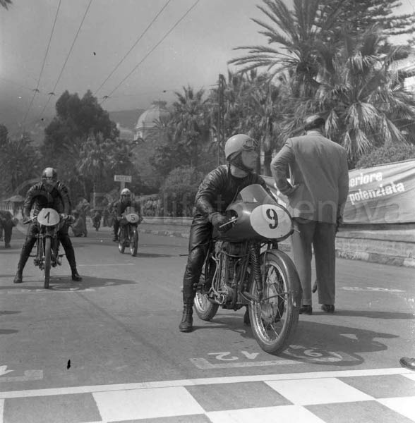 DESCRIZIONE:GARA MOTOCICLISTICA SUL CIRCUITO DI OSPEDALETTI: IN PRIMO PIANO CARLO UBBIALI SU M.V. CASA, SULLO SFONDO CARLO POGGI SU M.V.