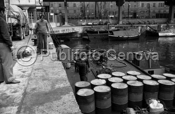 OPERAZIONI DI SCARICO BARILI SULLA DARSENA. SULLO SFONDO, LA SOPRAELEVATA