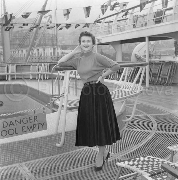DESCRIZIONE:LA BALLERINA PAT WOOD A BORDO DEL TRANSATLANTICO AMERICANO INDEPENDENCE IN ARRIVO ALLA STAZIONE MARITTIMA DI GENOVA (IN OCCASIONE DELLA CROCIERA DEI MILIARDARI)