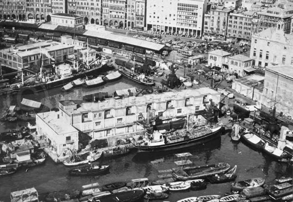 VEDUTA DEL PORTO DI GENOVA DALL'ALTO: PIAZZA CARICAMENTO (IL PONTE DOVE OGGI SORGE, IN SEGUITO AL RECUPERO DELL'AREA DEL PORTO ANTICO, IL COSIDDETTO "BIGO" PROGETTATO DALL'ARCHITETTO RENZO PIANO)