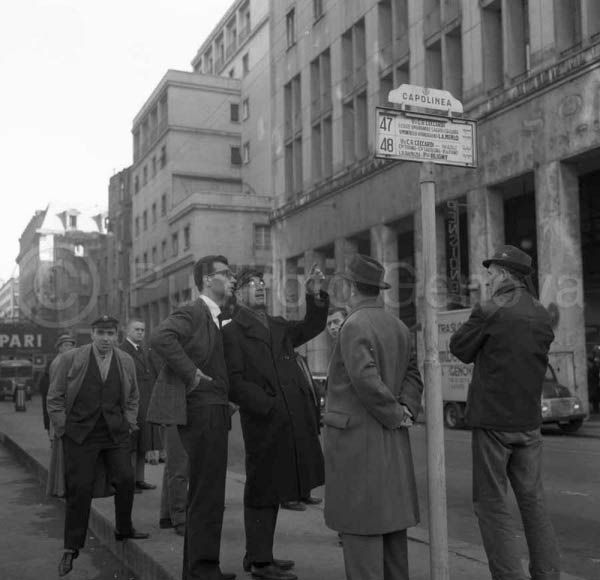 DESCRIZIONE:PERSONE ALLA FERMATA DELL'AUTOBUS