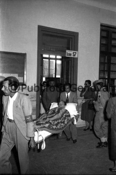 ELEZIONI POLITICHE 1958: UN MALATO VIENE RICONDOTTO ALL'OSPEDALE DOPO AVER ESPRESSO IL VOTO PRESSO I SEGGI ELETTORALI ALLESTITI AL LICEO DORIA DI VIA A. DIAZ