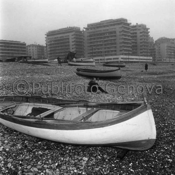 DESCRIZIONE:SERVIZIO PER LA COPERTINA DEL 45 GIRI DI GINO PAOLI "SASSI". IL CANTANTE IN SPIAGGIA ALLA FOCE.SULLO SFONDO I PALAZZI DI PIAZZA ROSSETTI