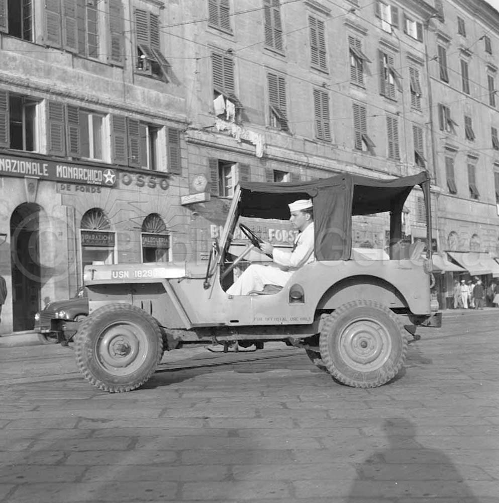DESCRIZIONE:MARINAI AMERICANI SBARCATI DALLE PORTAEREE IN JEEP SU VIA GRAMSCI A GENOVA